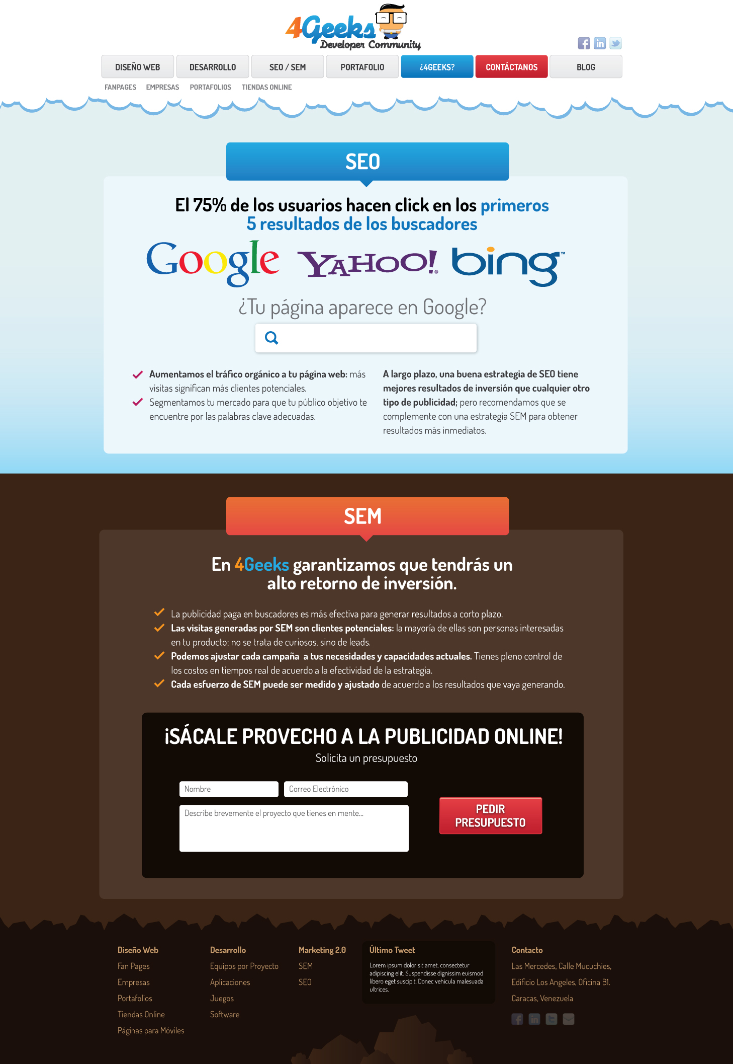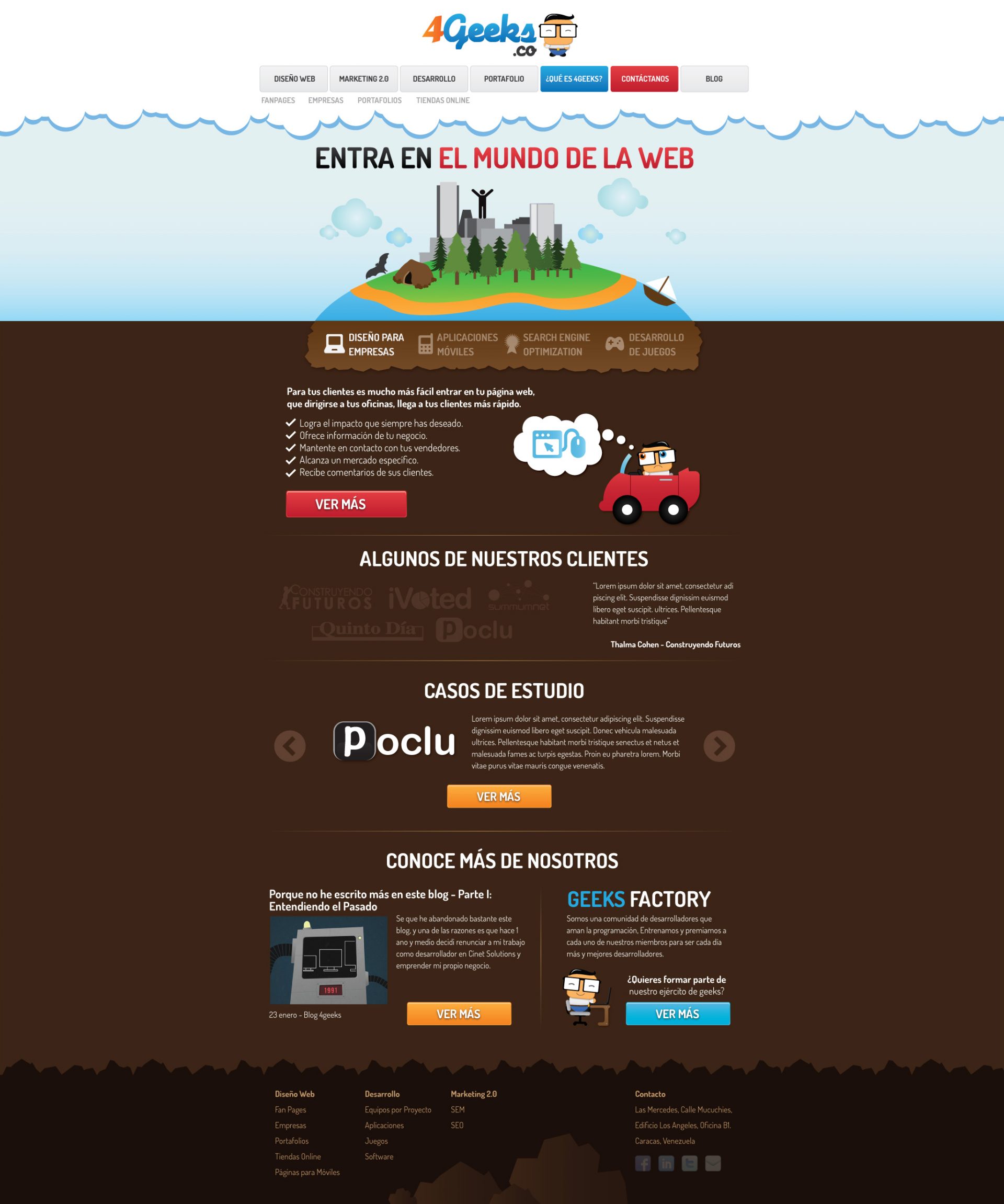 I worked with 4Geeks from their beginning, I was basically the Sr. Designer for all web design projects, this particular one was for the Company itself. We wanted to give it a "Geeky" and playful look and feel and use it as our main hub to promote our Web Services.