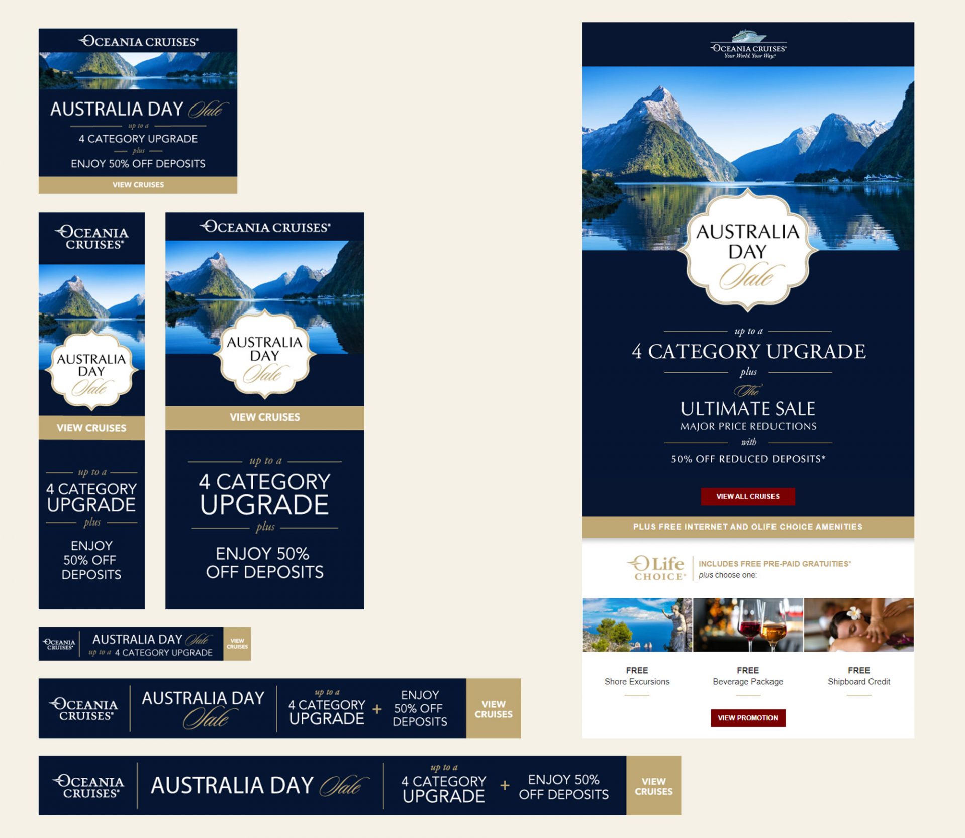 Build consistent assets for a Australia Day Sale limited-time offer campaign, on this campaign all of the assets had to be translated in German and Portuguese and they included Web Banners, Ad Banners, Social Media Tiles for Facebook and Instagram and Email. Used Software: Photoshop, Illustrator, Dreamweaver.