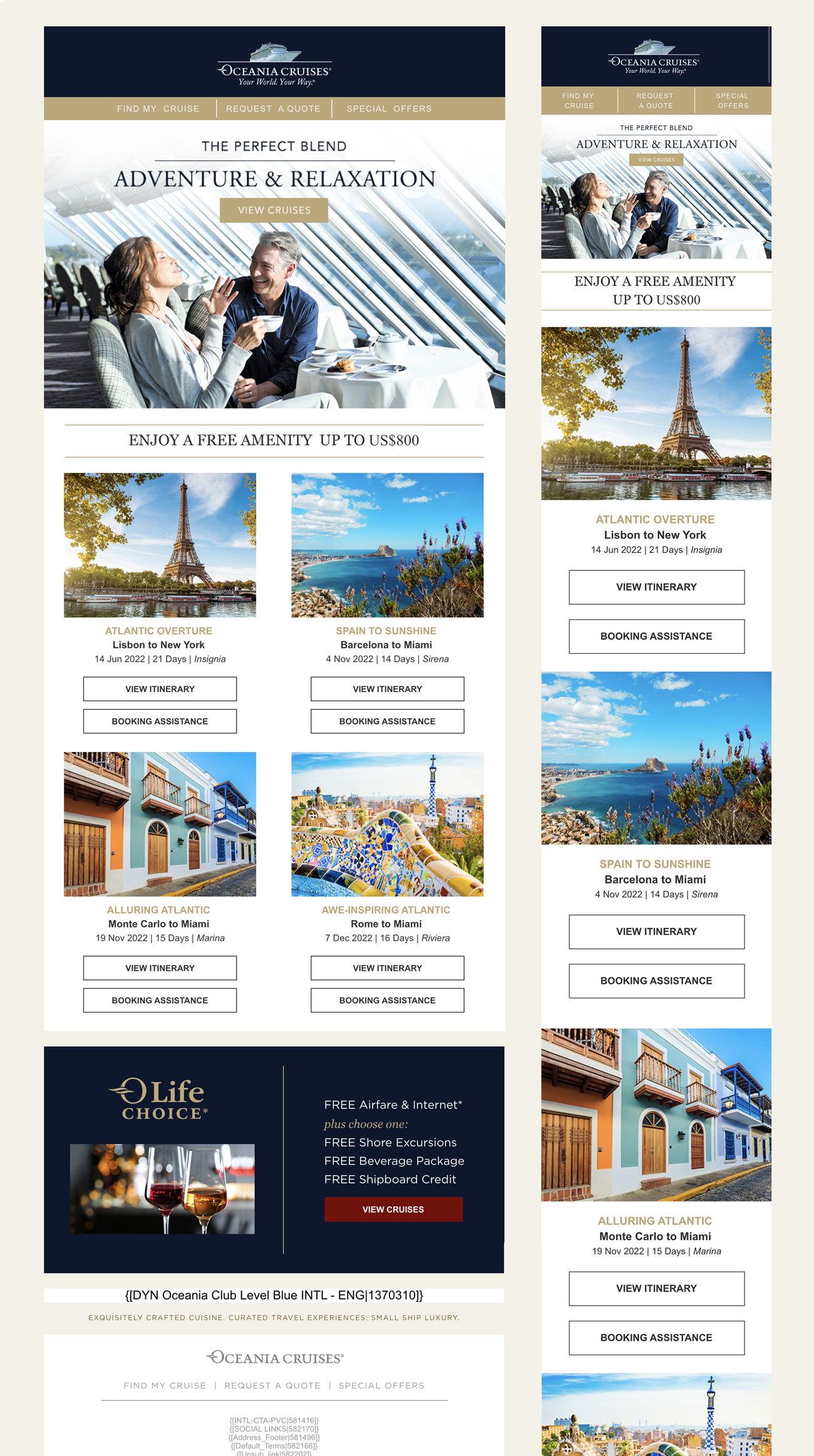 Design a responsive email based on a specific brief provided by Marketing Manager. Software used: Photoshop and Dreamweaver. My role was to develop a template which will be used for different email platforms. I did the testing and optimization in Litmus and deployed using Cheetah Marketing Suite.